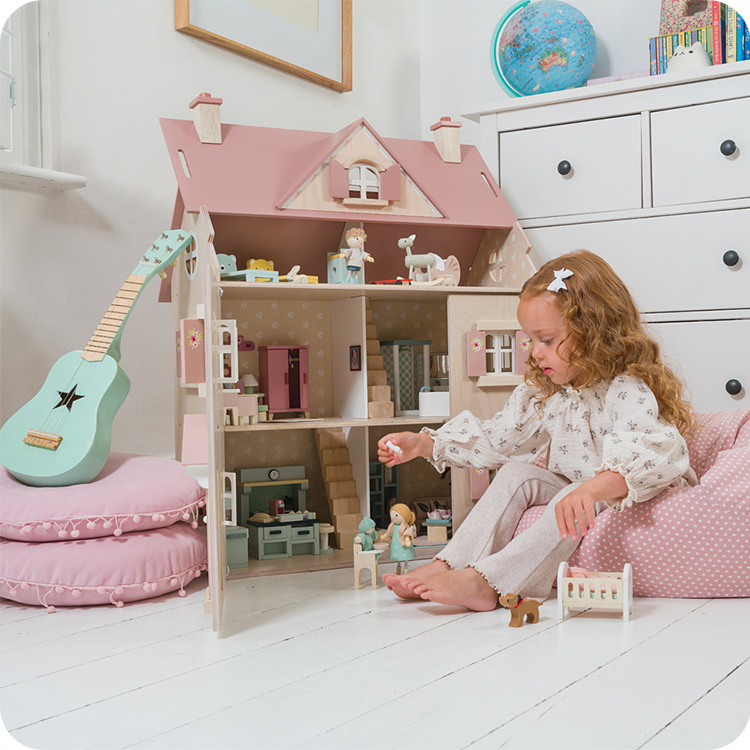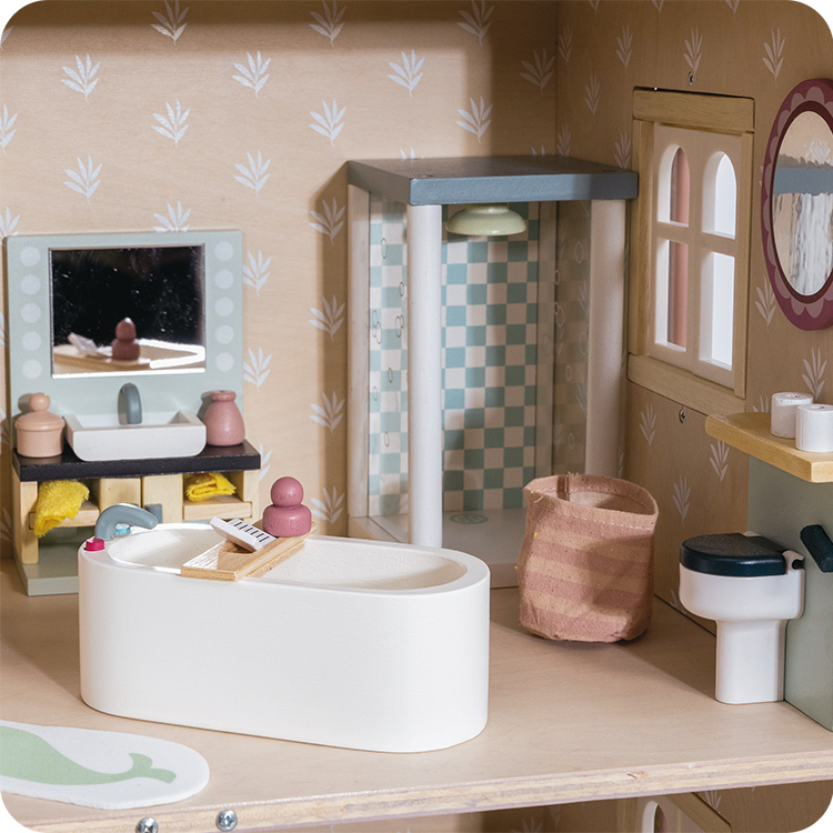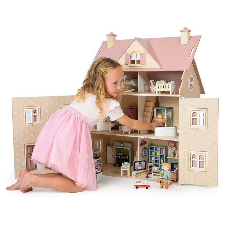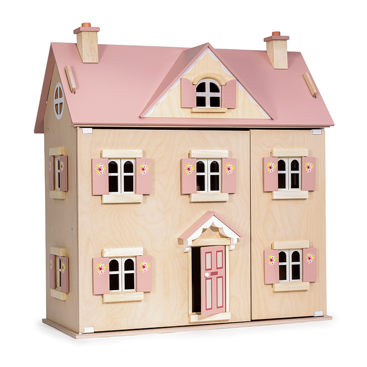這是一棟精緻的夢幻娃娃屋,以莫蘭迪粉與花卉圖騰妝點。這座五房設計的莊園在正面與側面共有10扇窗戶,且每一扇都配有可自由開關的百葉窗與窗扇。正門上方的門廊山牆與優雅的斜頂屋脊,為娃娃家庭營造出一種溫馨而奢華的居家氛圍。