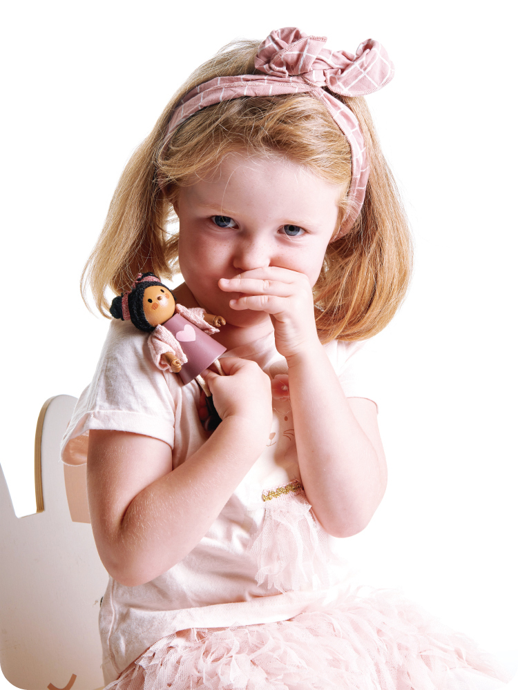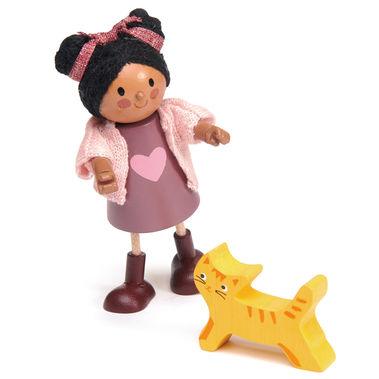人偶四肢靈活,或站或坐,可任意擺動姿勢。 綁著兩顆包包頭的的艾雅娜和一隻寵物小貓。透過角色扮演,滿足孩子模仿的好奇心,促進語言發展與溝通能力。父母一同遊戲,角色替換,聆聽彼此的聲音,生活中相互體諒。