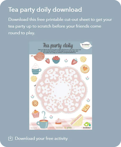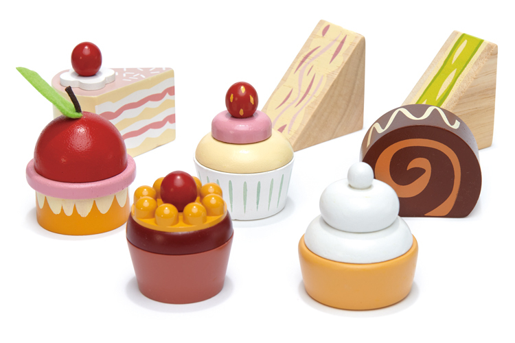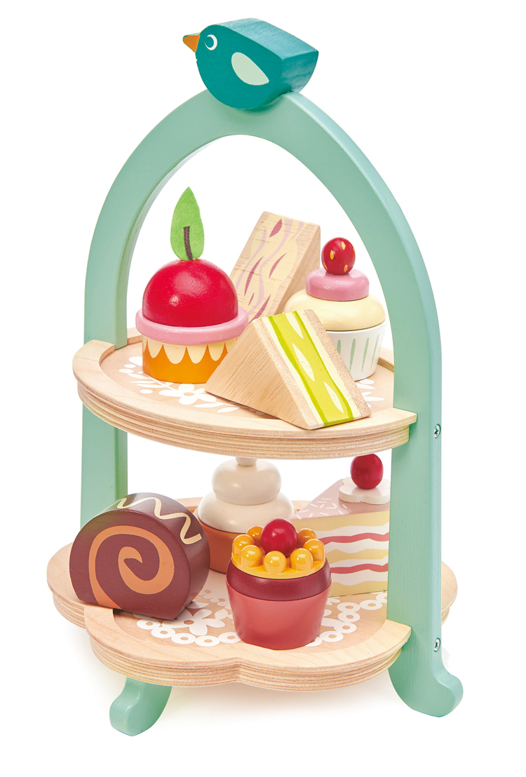 雙層點心架搭配精緻蕾絲花邊圖騰托盤,擺上各式木製甜點,讓孩子在遊戲中學習點心名稱與下午茶禮儀。