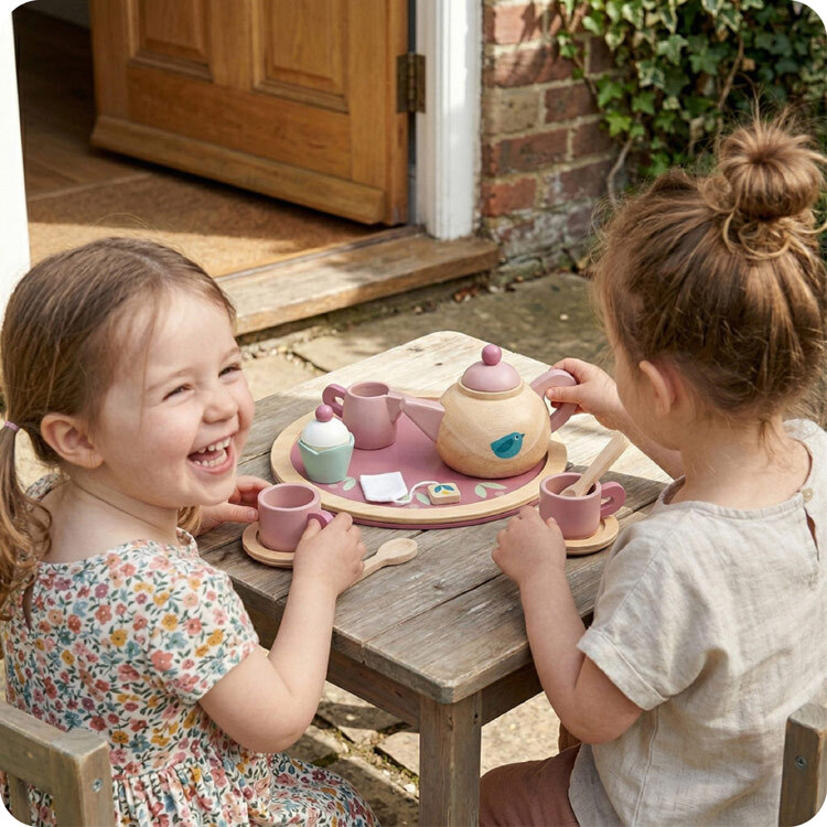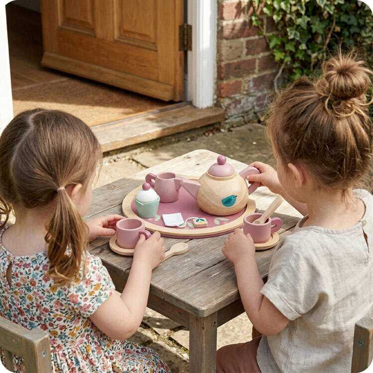 浪漫木製茶具:茶壺及杯具組讓孩子於遊戲中學會器具使用。質感精細、歷久彌新,除作為遊戲組外,亦可做為家中擺設。透過家家酒遊戲,訓練兒童社交能力,藉此觀察孩子的想法、語言發展及敘事能力,助於孩子多元智能的發展。