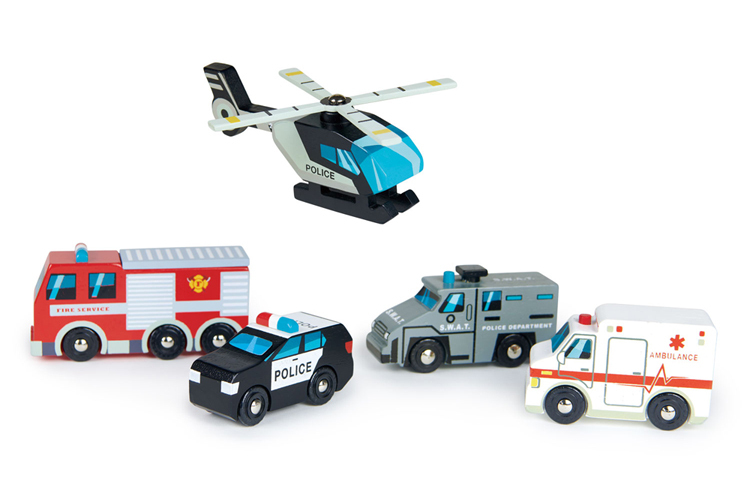 2. 《即刻救援車隊》實木打造的車輛,套組包含:旋翼葉片直升機、救護車、消防車、警車和特警車(S.W.A.T.特殊突擊部隊車)。