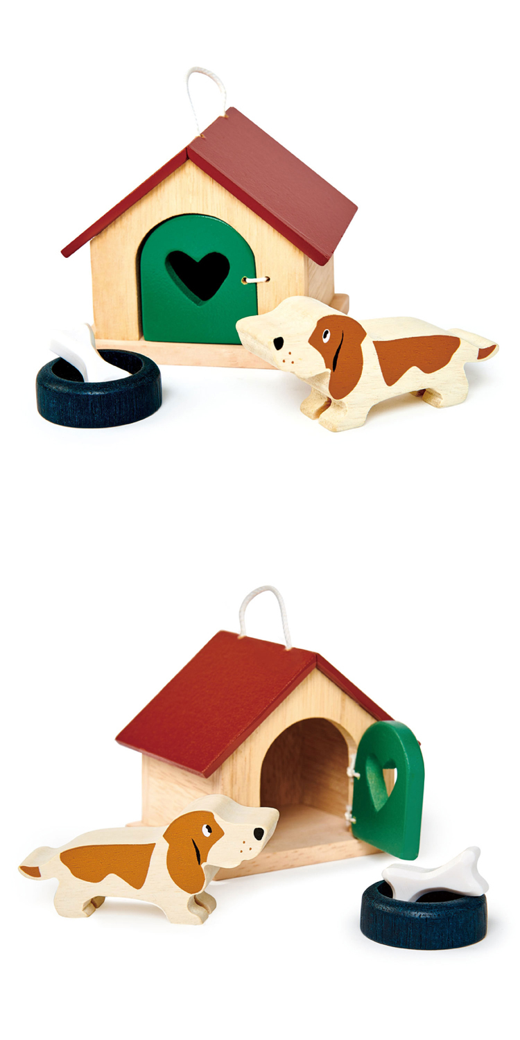 一隻迷人的巴吉度獵犬,附有一個碗和一根骨頭。漂亮的狗舍,帶有可開啟的門和手提把手。適用於所有木製娃娃屋,比例為1:12。