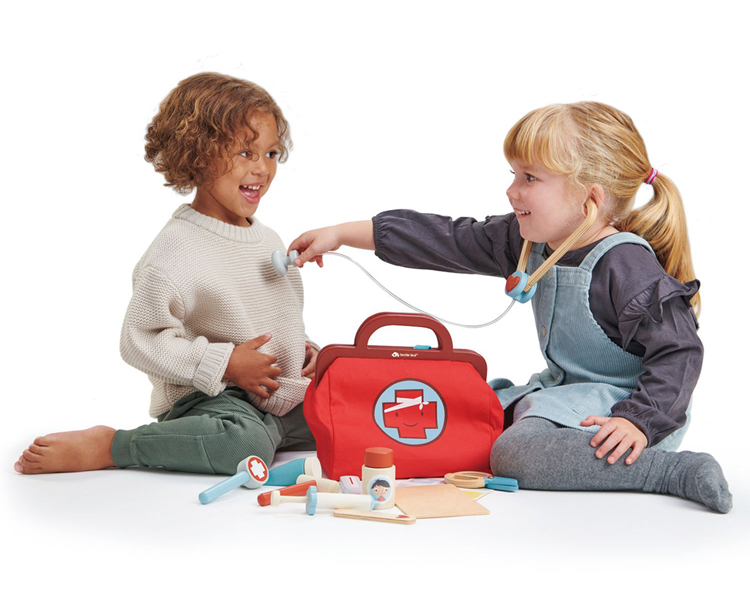 復古風格的帆布診療包,上附木製提把,手柄加了一小塊磁鐵能使其扣住,裡面裝滿了醫護治療患者的必需品!主題明確,遊戲中認識醫療與健康的重要性,強化現實生活認知,降低對打針、吃藥的恐懼感。互動中融入生活情境,培育孩子富有同情心與愛心。精緻的帆布收納袋,養成收納玩具的好習慣,幫助玩具不流浪。