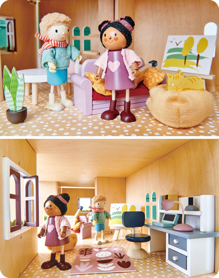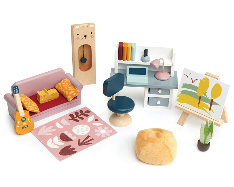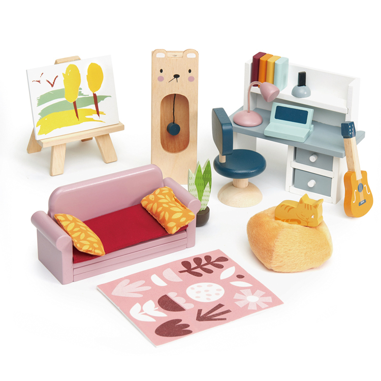 內含豐富的家家酒配件:時尚的旋轉辦公椅、書桌、筆電、手機架、檯燈、4本書、吉他、貓、懶骨頭椅、室內盆栽植物、漂亮的地毯和造型熊落地時鐘。還有含椅墊和2個印花枕頭的可拉出沙發,以及附有風景畫的木製畫架,提供多樣化的選擇。