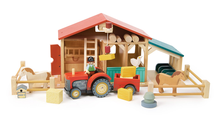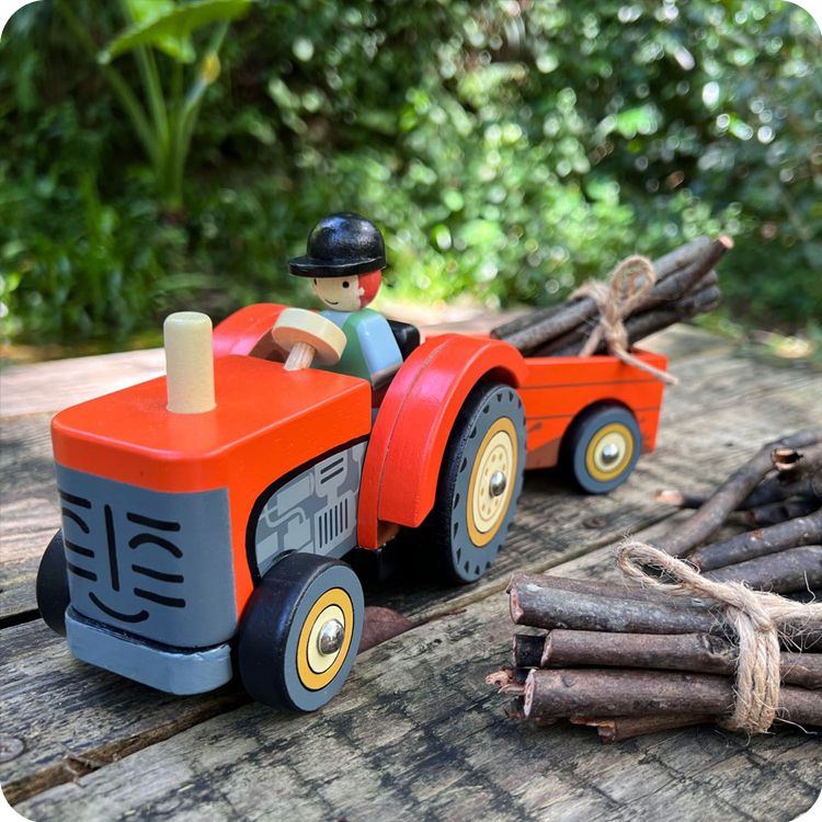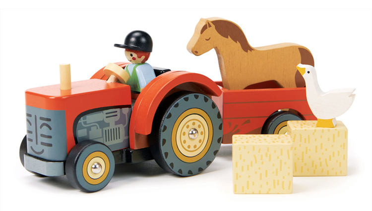 歡快的農場拖拉機和可拆式拖車。有司機、兩個牧草堆、馬和鵝。車身點綴著插圖細節。