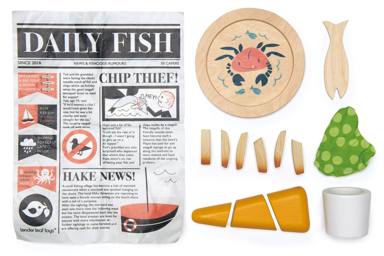 ★ 豐富的配件:海蟹圖案的盤子,魚叉,盛豆泥的杯子,全部包裹在《每日魚》報紙上!