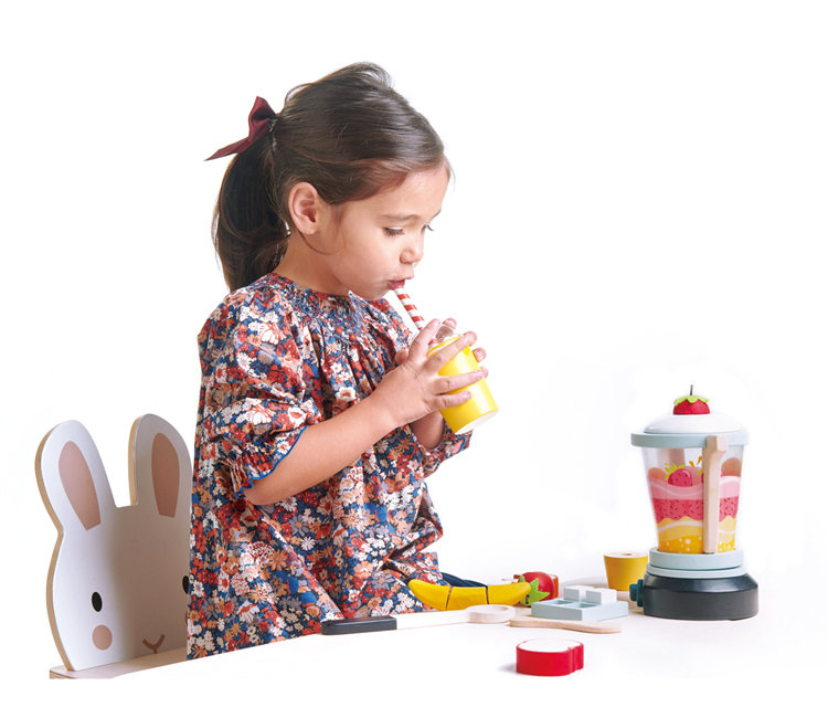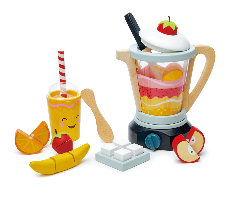 喀啦喀啦,小廚師正在打水果奶昔囉!先把水果洗乾淨,吃下肚子不生病,香蕉、草莓、蘋果與橙子,一個一個對半切,再拿冰塊來消暑,一杯牛奶、兩匙糖,按下果汁機鈕拌一拌,環保杯插上糖果色粗吸管,一杯精力滿點的水果奶昔完成了!可切開的各式水果:蘋果、草莓、香蕉和柳橙,擬真果汁機和外帶杯,組成了小寶貝們看到就想動手的冰果奶昔。這組遊戲組包含可切開的木製水果、擬真的果汁機、時尚外帶杯和條紋吸管,讓孩子一邊扮演小廚師、一邊認識食材,從遊戲中培養生活常識與珍惜食物的好習慣。無需擔心沉重的機器或玻璃材質,全木製設計安全又安心,是角色扮演與親子共玩的理想選擇。