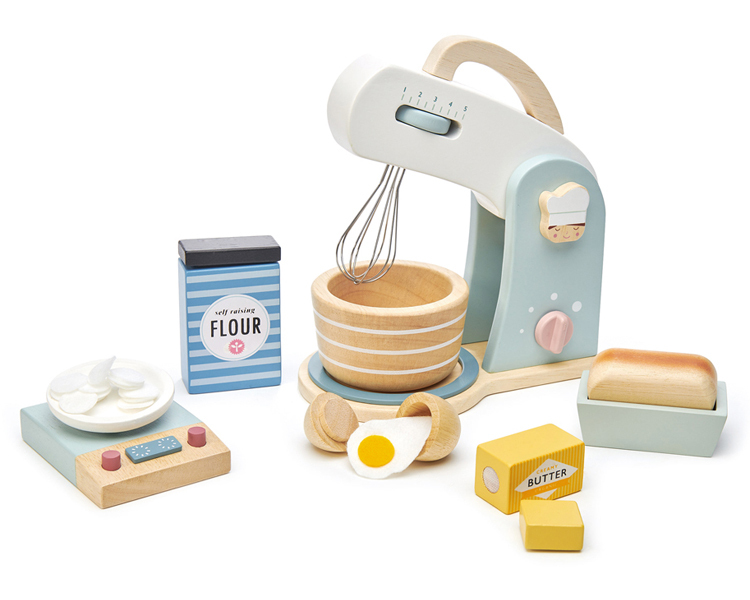 一款時尚攪拌器,附有金屬旋轉功能的打蛋器與木碗,開/關按鈕。磅蛋糕模、料理秤及一個木製雞蛋(可以打開),一包牛油和一盒麵粉(15片白色氈墊)。透過角色扮演遊戲,建立兒童社會化第一步,學會換位思考與同理心。孩童可以自行創造故事,發揮演繹能力。