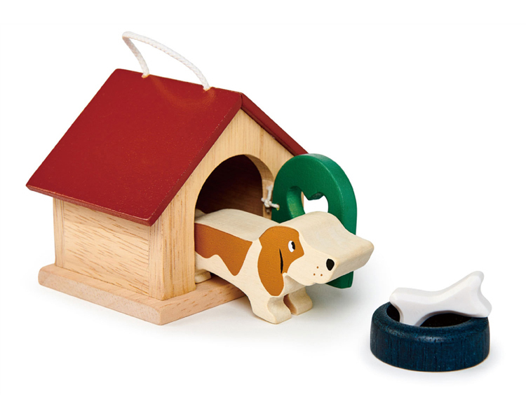 一隻迷人的巴吉度獵犬,附有一個碗和一根骨頭。漂亮的狗舍,帶有可開啟的門和手提把手。適用於所有木製娃娃屋,比例為1:12。