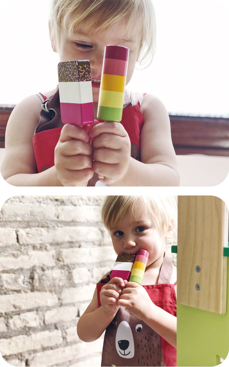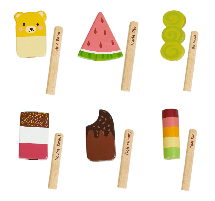 「歡迎光臨趣味十足的冰棒店!」這裡有6種各具風味的冰棒,全部採用實木製作,並塗上繽紛誘人的色彩。每根冰棒的棒子都可拆卸,在隱藏處還印有甜美的小訊息,等你來發現!現在就和朋友一起進行混搭和猜迷遊戲吧~