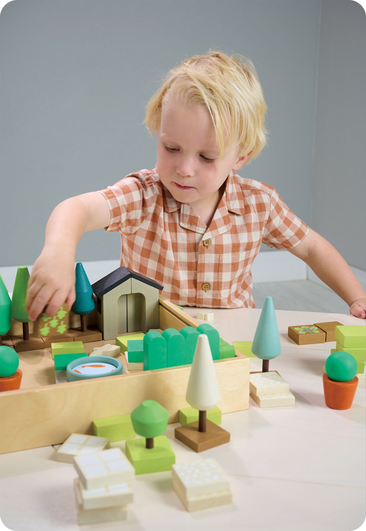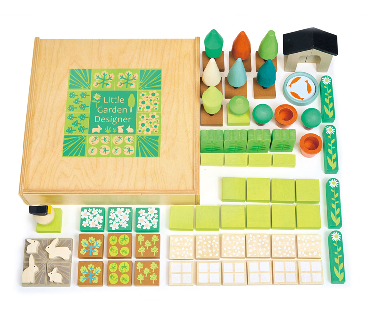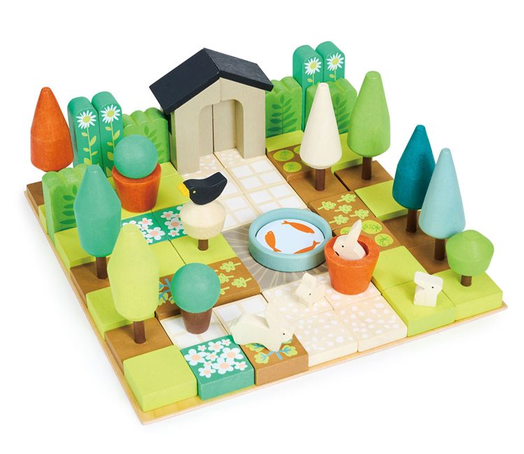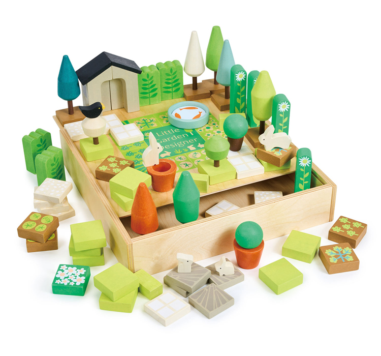 這款精美的花園造景遊戲是我們的開放式玩具系列之一,共由 67 塊積木組成,可以佈置排列成無數種花園設計。所有的配件都能收納在附有滑蓋的美麗木盒中!