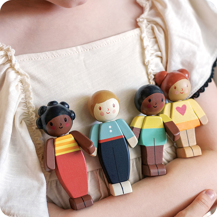 此系列的木娃娃採用永續環保橡膠木製成,質感溫潤、手感舒適。每個娃娃擁有可活動的手臂與細緻手工繪製的表情,搭配不同膚色與亮麗服裝,挑選出最貼近自己家庭樣貌的角色,玩出歸屬感與共融價值。