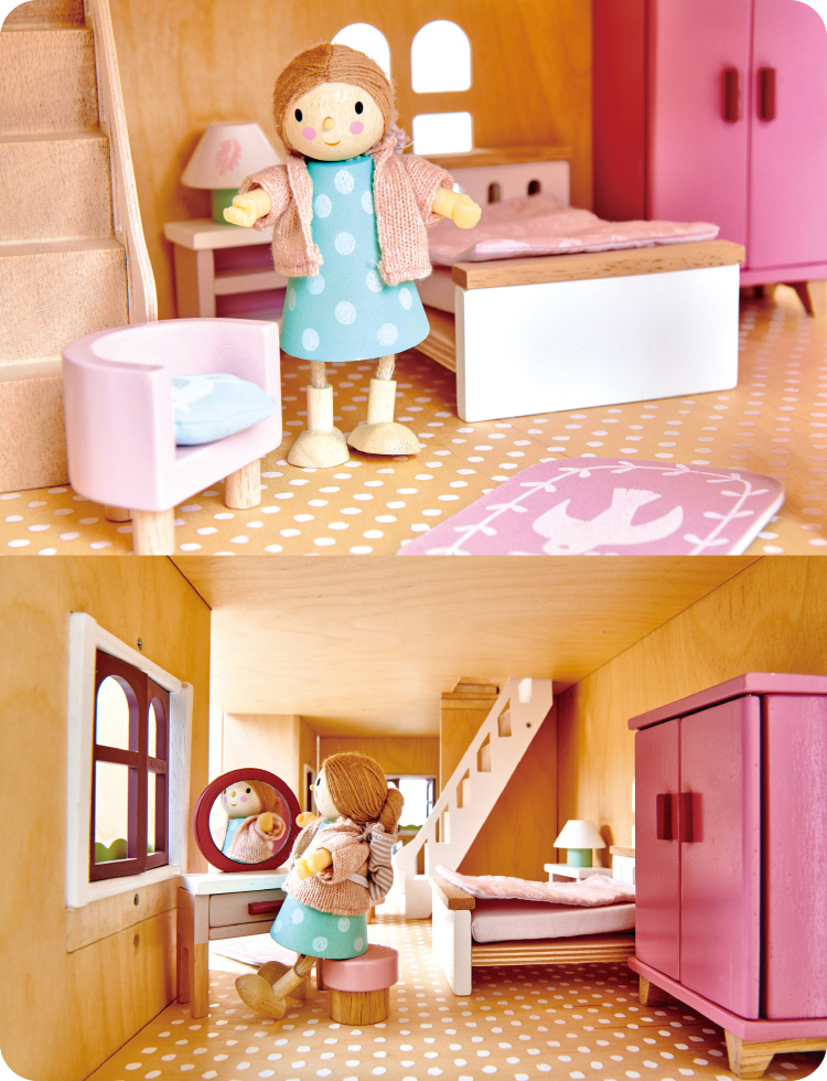 人偶四肢靈活,或站或坐,可任意擺動姿勢。透過角色扮演,滿足孩子模仿的好奇心,促進語言發展與溝通能力。遊戲中融入生活情境,幫助孩子認識家庭角色,逐步培育良好的家庭觀念。父母可一同遊戲,角色替換,聆聽彼此的聲音,生活中相互體諒。