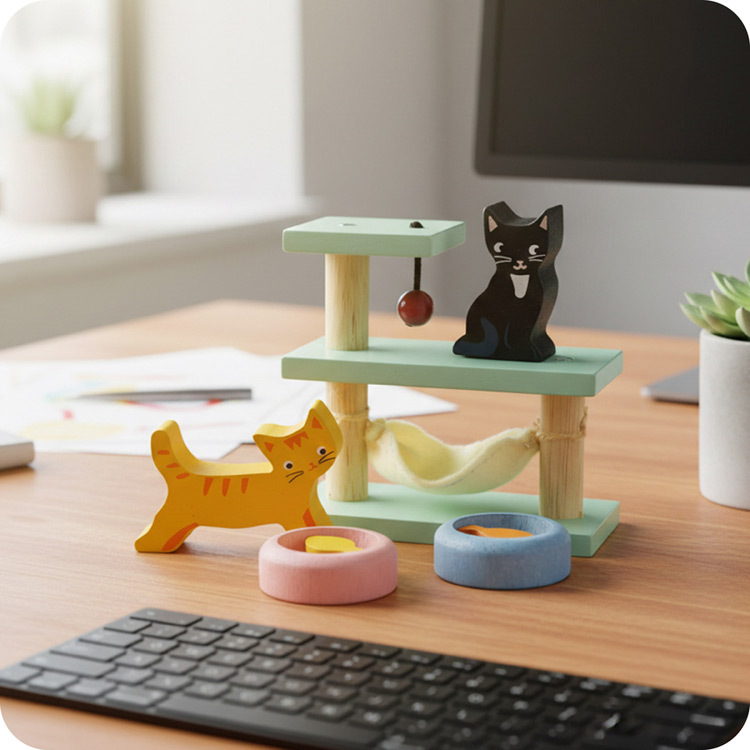 2隻小貓,黑色和薑黃色,牠們有一張遊戲跳台和球,可以自娛自樂。2 不同顏色的碗,每個碗裡有一條魚作為晚餐!適用於所有的木製娃娃屋,比例為1:12。積木強化抓握能力,孩子藉由擺放動作練習手眼協調,也可以設立故事情境,架構邏輯思考,促進小肌肉精細運動的發展。