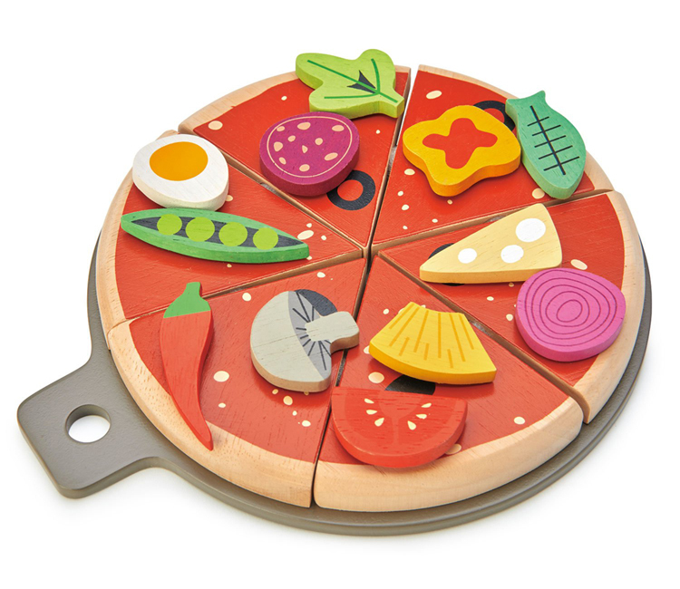 每個人都喜歡披薩! 可以創造屬於自己的口味,並裝入披薩盒中外送。預先切成6片,排列在一個披薩餅托盤上,享受安排12種不同配料的樂趣。所有的配料都是可以互換的,並由魔術貼固定住。