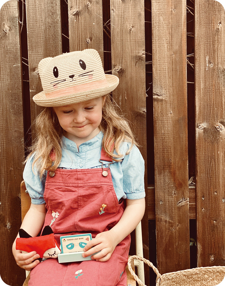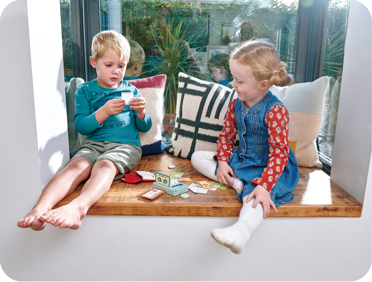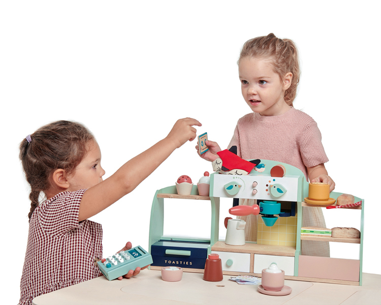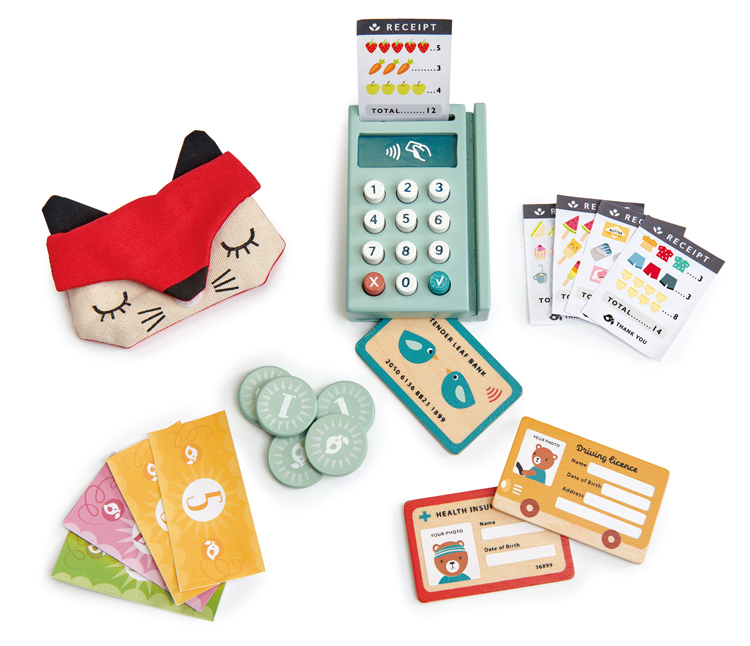 一個帶有柔軟數字按鈕的讀卡機,有一個插槽可以使用 Tender Leaf 信用卡,頂部有一個插槽可以放置5張不同插圖的收據。一個帆布錢包裡有一張健康卡和一張身份證,兩面都有插圖,有空間可以寫名字或貼照片。還有6張假紙幣和5枚硬幣。