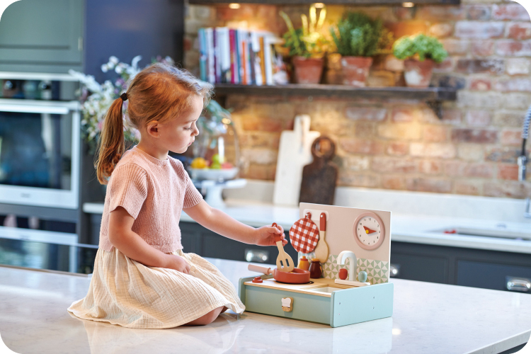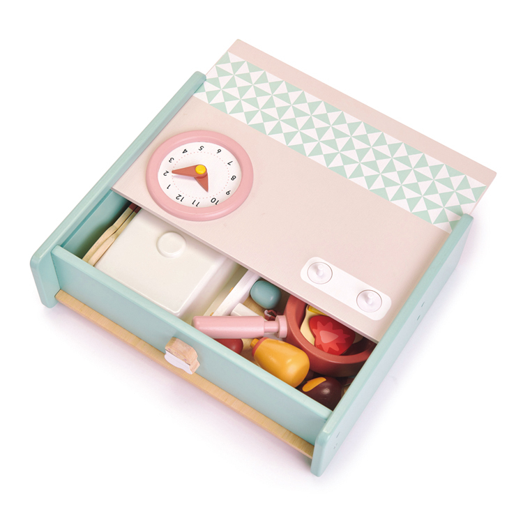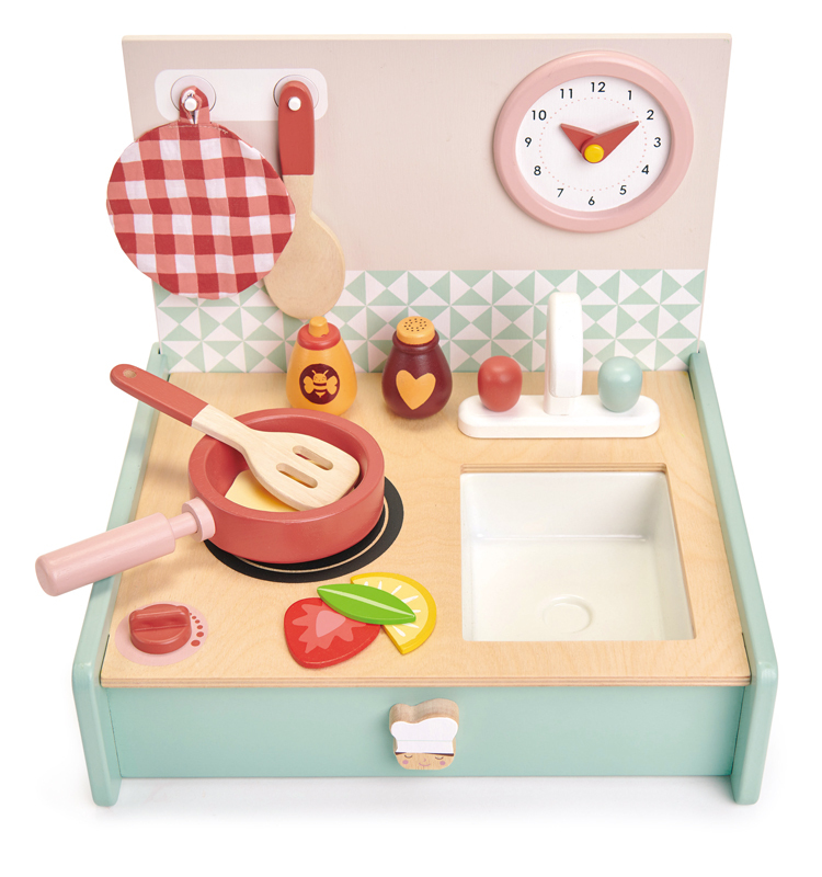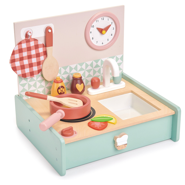 攜帶式折疊小廚房輕巧方便,附有可愛的學習時鐘,讓孩子邊玩邊學習看時間。