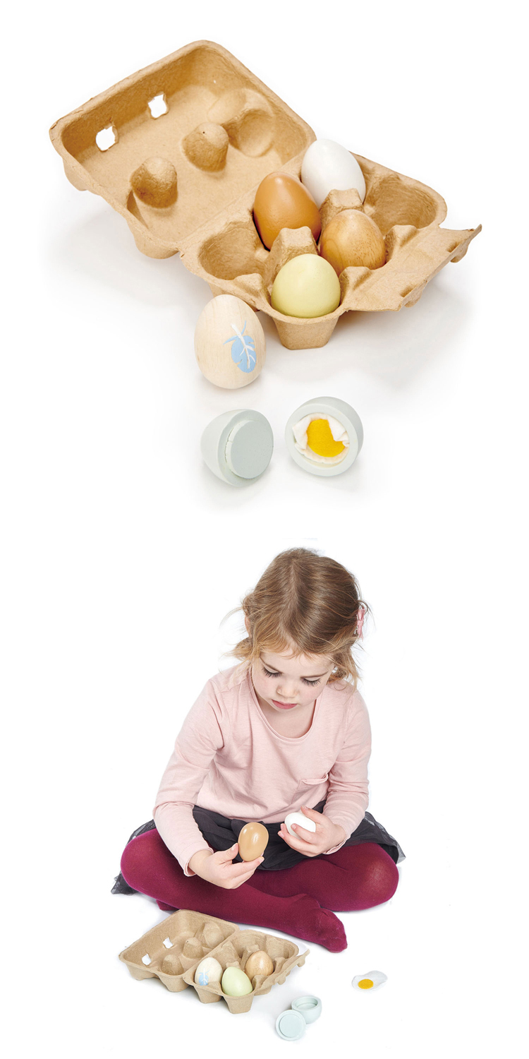 盒中收納 6 顆可愛實木雞蛋,裝在仿真的紙質蛋盒裡,等你開店上菜!