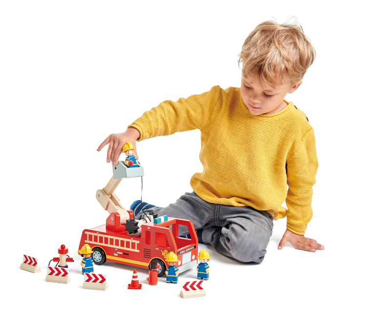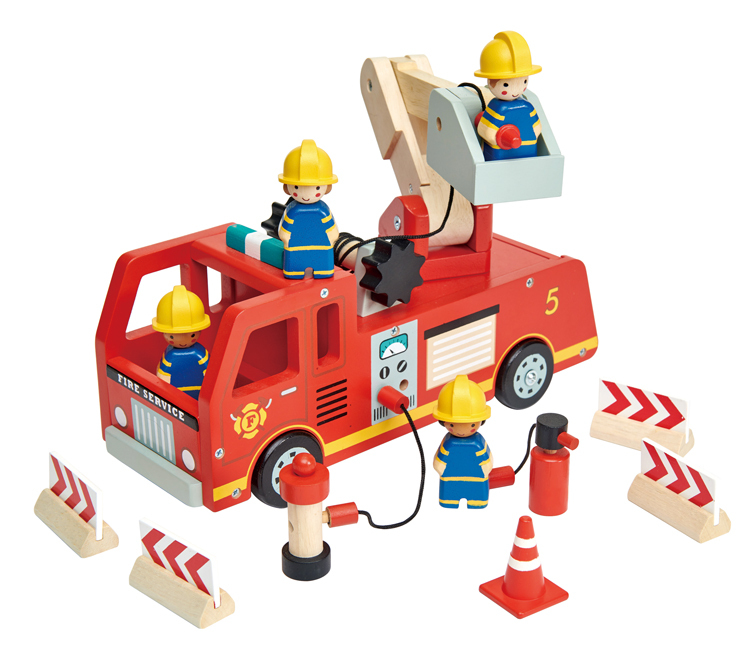 這輛明亮的消防車配有可展開的水管和延伸臂,可將4名消防員帶到極高的地方,以對抗火災或拯救小貓!