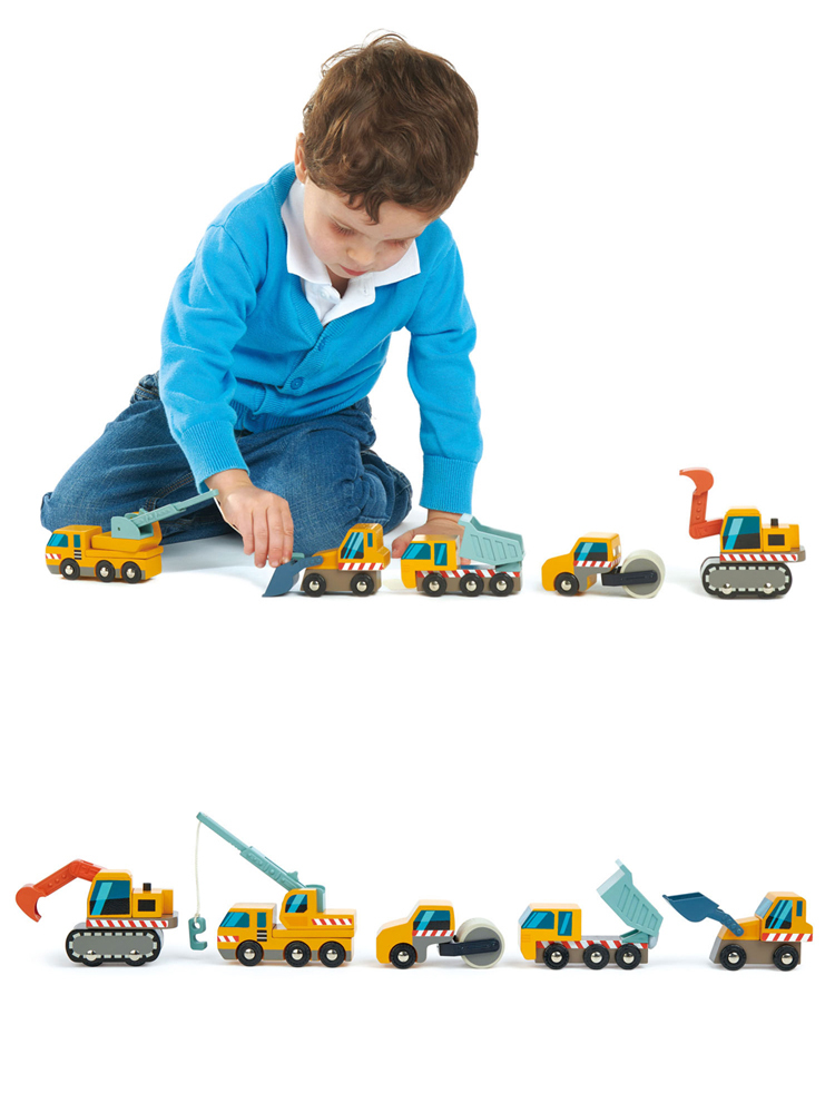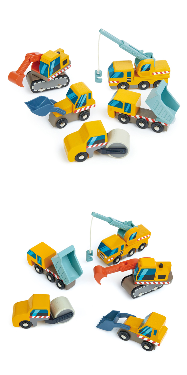 挖土機、起重機、壓路機、砂石車、推土機,所有功能全面包辦。 起重機手臂可伸縮,旋轉車體搭配纜線,輕鬆吊掛重物。 壓路機的滾輪,執行壓路一把罩。傾卸式砂石車載運貨物超方便。父母可陪同玩耍,在遊戲中融入生活情境,激盪孩子的應變能力。