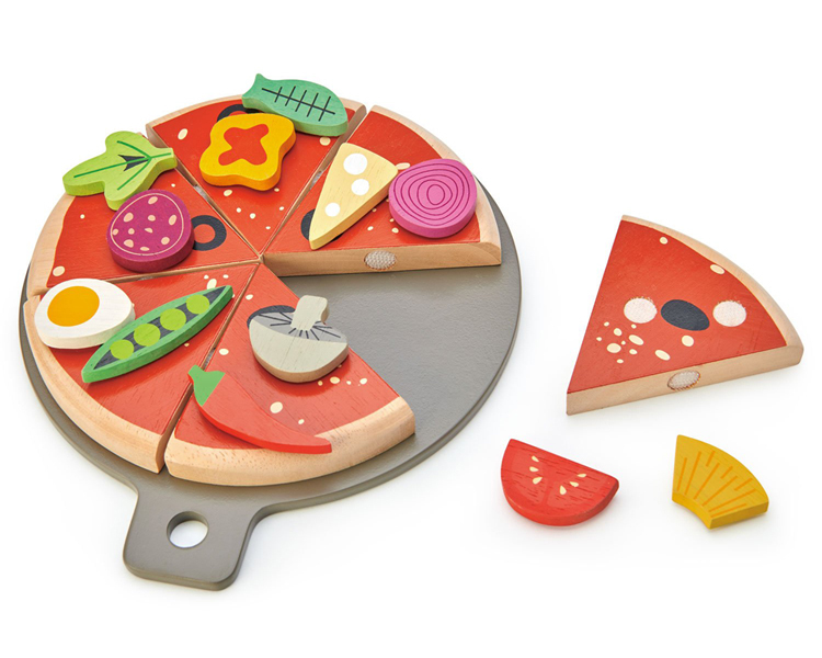 預先切成6片,排列在一個披薩餅托盤上,享受安排12種不同配料的樂趣。所有的配料都是可以互換的,並由魔術貼固定住。