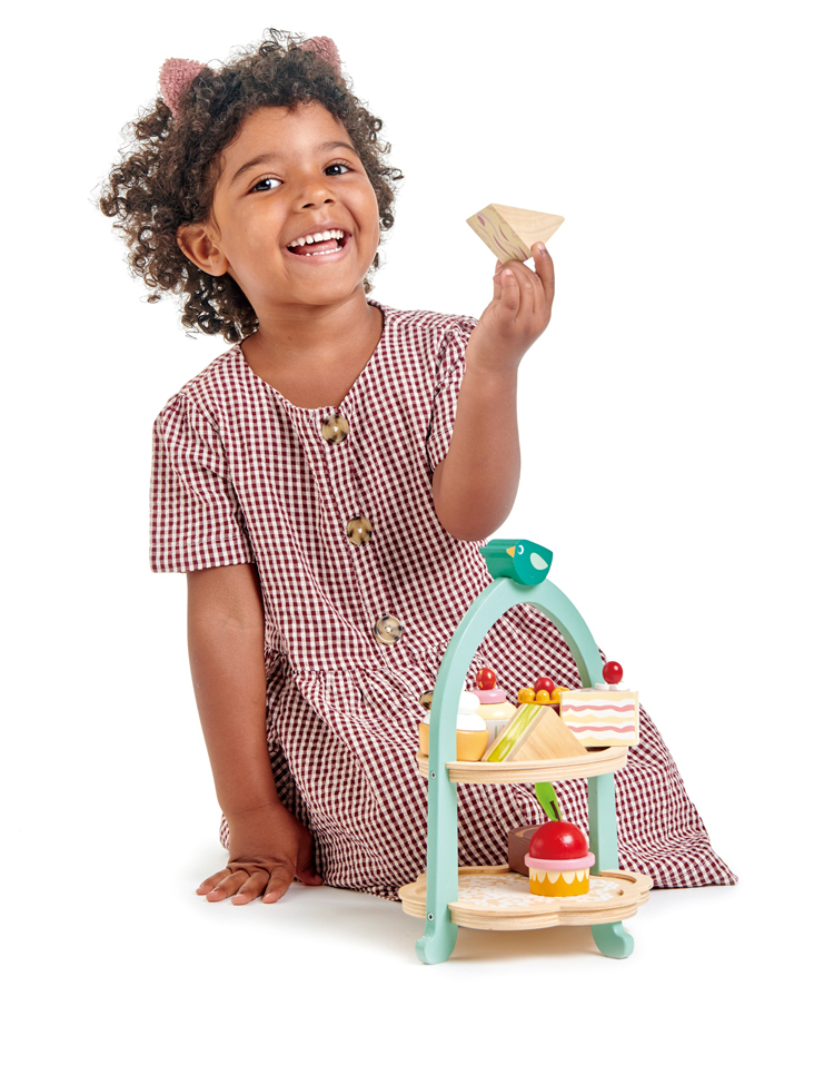 雙層點心架搭配精緻蕾絲花邊圖騰托盤,擺上各式木製甜點,讓孩子在遊戲中學習點心名稱與下午茶禮儀。