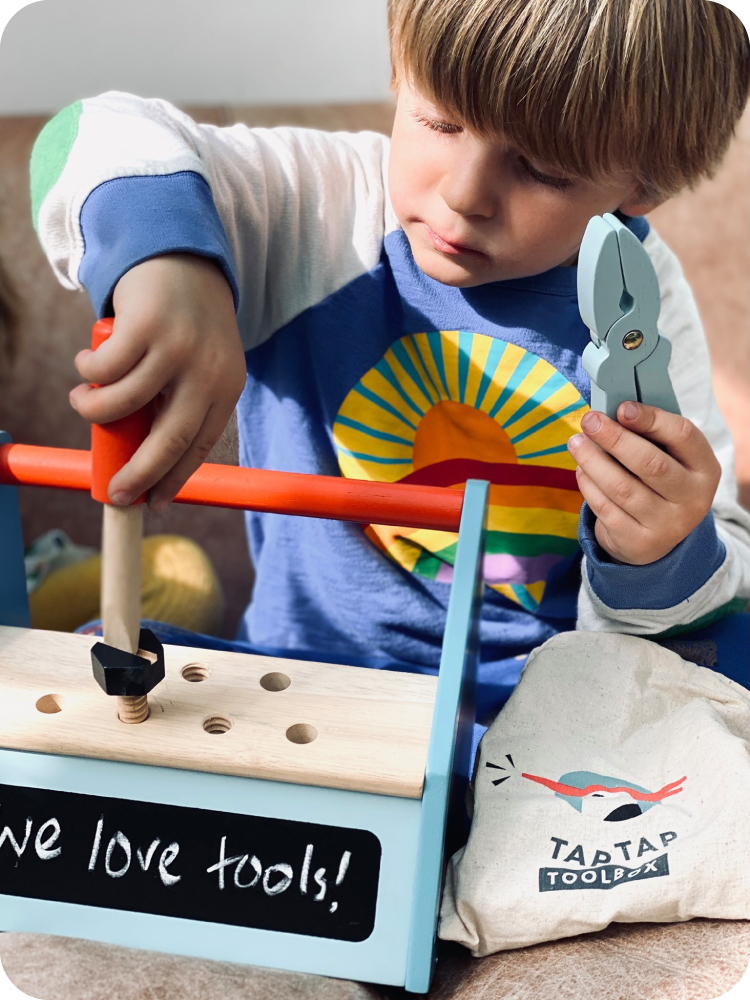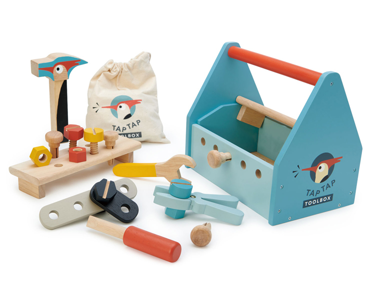 這是一款啄木鳥主題的工具箱,配備齊全,適合喜歡鎖東敲西的活躍幼兒。裡面裝滿了建造東西所需的一切:2個可拆卸的蓋子,它們是可被擰緊的面板。附一個束口布印袋,玩完後能打包帶走,這套隨身工具箱還包含了一把啄木鳥錘子、鉗子、螺絲起子、扳手、2個螺絲、2個螺栓、2塊木板、4個螺帽和4個釘子。