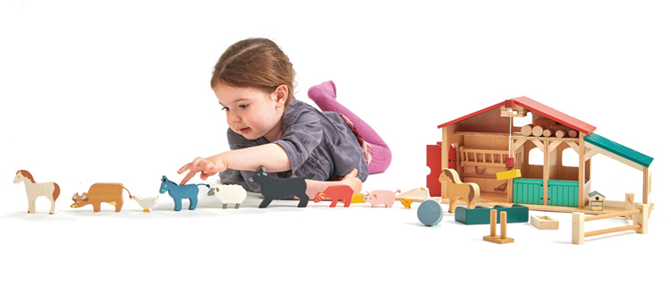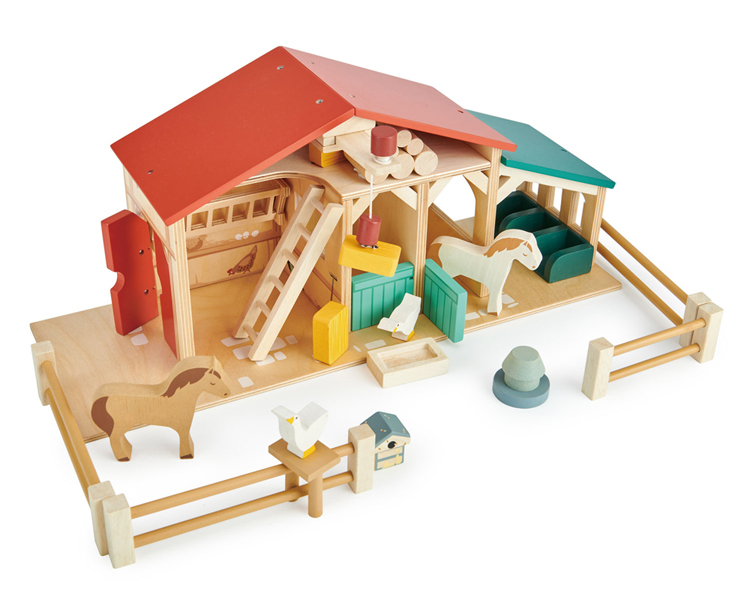 我適合小手操作的開放式設計!豐富的配件:附一扇紅色大門與餵食槽的穀倉,2間帶著門扉的馬厩,一個通向乾草閣樓的梯子,還有具磁性端的滑輪升降系統,用於拉升乾草捆等等,多種配件豐富整個農場遊戲。