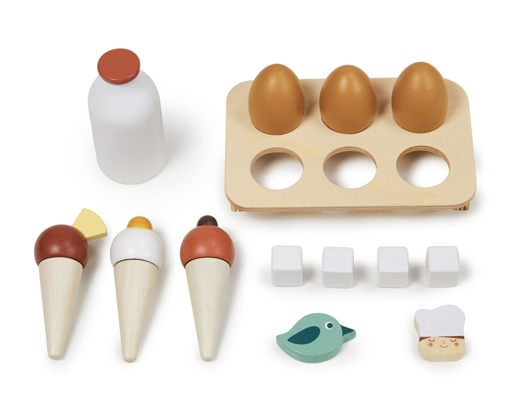 ※附:三個冰淇淋甜筒、三顆棕色土雞蛋、四顆冰塊、蛋架、牛奶、小廚師造型磁鐵及小鳥造型磁鐵
