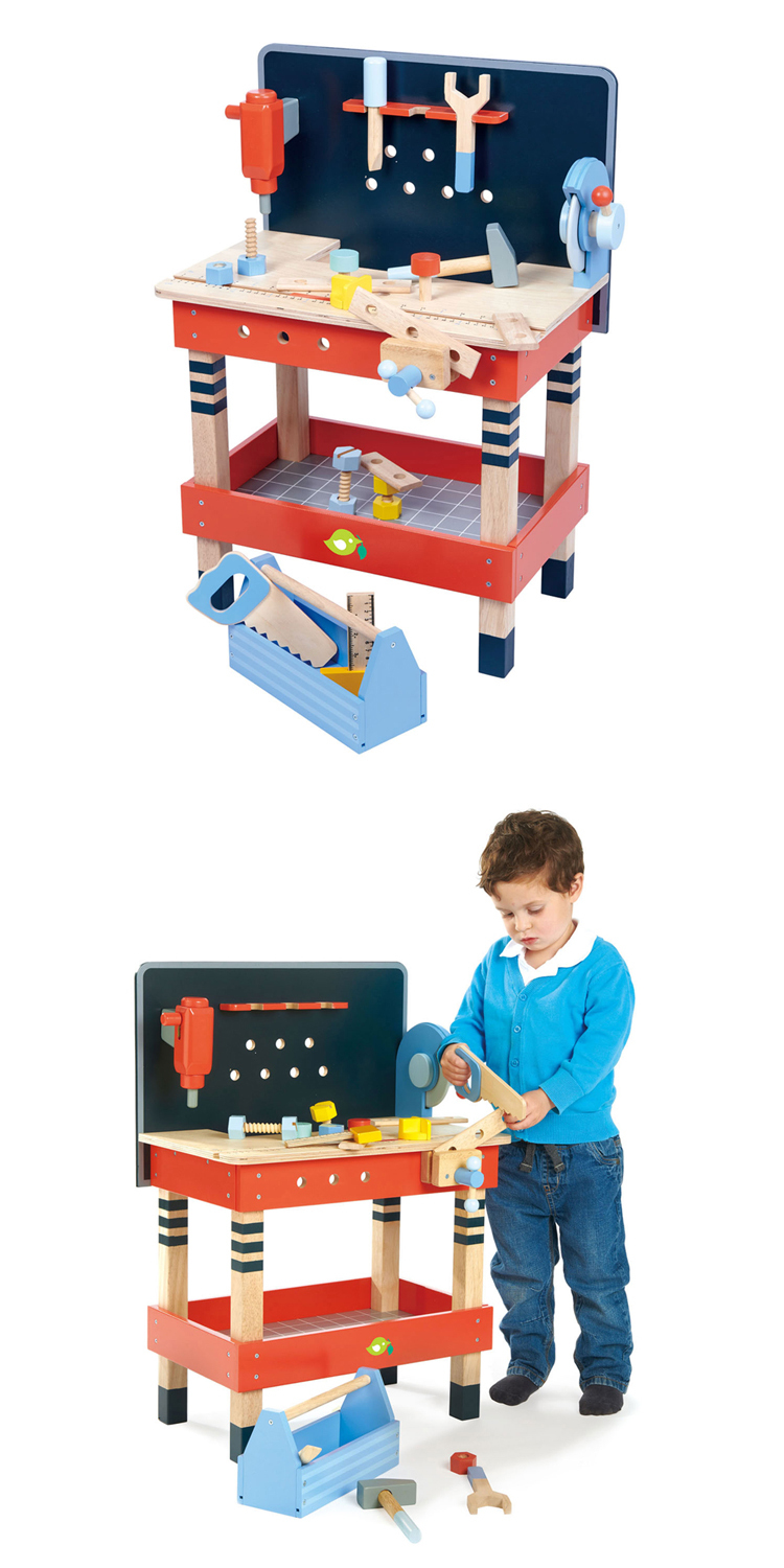 這款工具檯能讓孩子一秒變身成小小工匠,開啟創作之旅。它由19個零件組成,背板上有可拆卸的電鑽、圓鋸以及一個擺放錘子、螺絲刀和扳手的架子。在檯面上,有一個方便的尺子,帶有可滑動的右手角和可操作的虎鉗。工具箱可以裝滿螺帽和螺栓,並從檯子上取出進行延續遊戲。