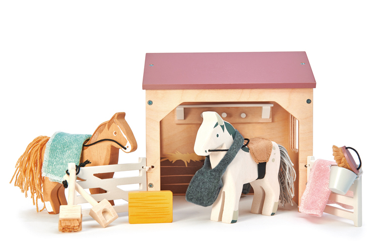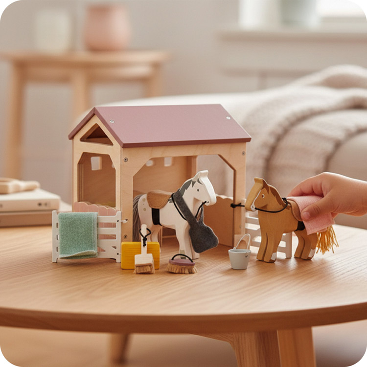 擁有趣味元素:配有水桶,小鏟子和掃帚、刷子和2條毛毯、一捆乾草以及一個餵食袋。特製的木造馬廄,結構穩固,營造立體空間感,提供馬駒吃喝與休憩。家長可引入「馬」的相關資訊,遊戲中引導孩子認識馬匹的飲食、生活習性等,啟發孩子探索新鮮事物的好奇心。