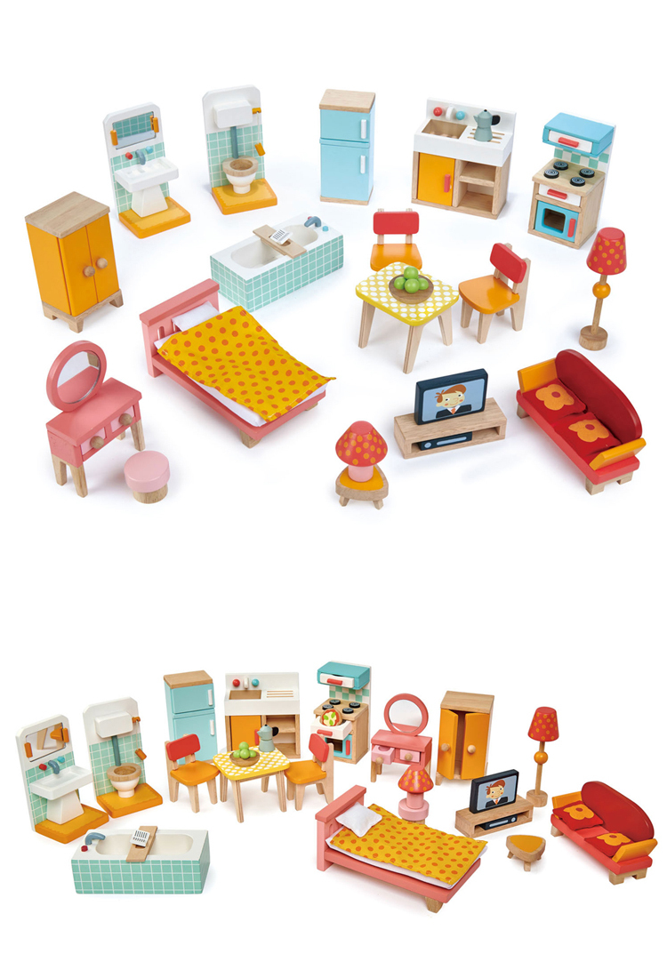 精心設計多款家具用品,如床鋪、衣櫃、水槽等,跨足廚房、浴室、起居室、臥室等四大空間,充沛有趣。透過扮家家酒中的角色扮演(role-play),來滿足孩子角色模仿的好奇心。有利於創意發想,同時整合邏輯思考以及語言溝通。