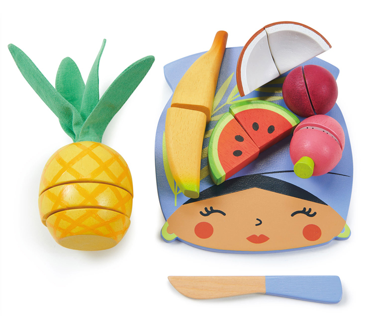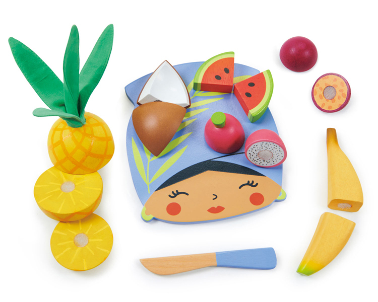 具異國情調的木製砧板和一把藍色小刀。有切成三等份的鳳梨、二等份的西瓜、椰子、香蕉、百香果和火龍果,附魔鬼氈設計以利於切開,以及包含用於整理的網袋。