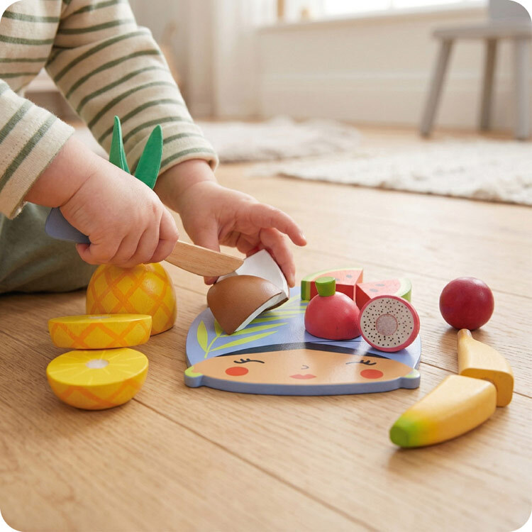 具異國情調的木製砧板和一把藍色小刀。有切成三等份的鳳梨、二等份的西瓜、椰子、香蕉、百香果和火龍果,附魔鬼氈設計以利於切開,以及包含用於整理的網袋。