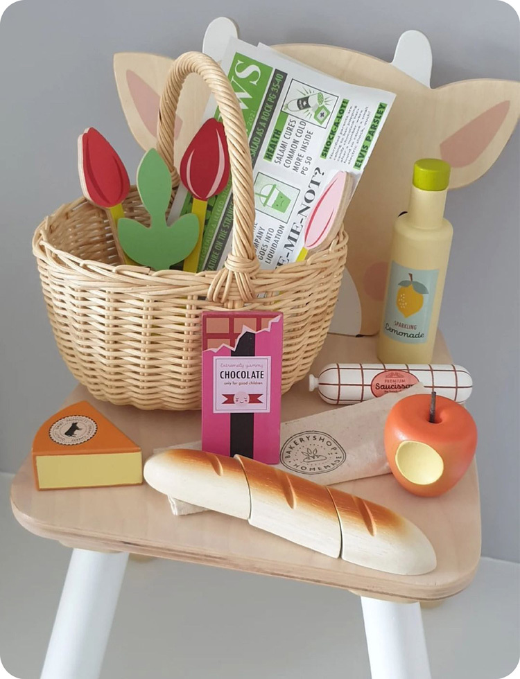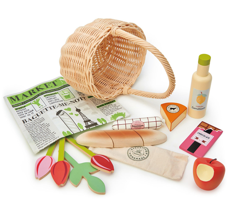 一個優雅的手工柳條籃子,裡面有巧克力、一瓶檸檬氣泡水、一份歐式意大利臘腸、一些奶酪、一個布袋裝的法式長棍麵包、三朵鬱金香和一片葉子、一顆被咬了一口的蘋果和一份報紙。維妙維肖的木製食材利於創意發想,各種形狀與顏色的積木能強化孩子的認知能力,增添家家酒樂趣。