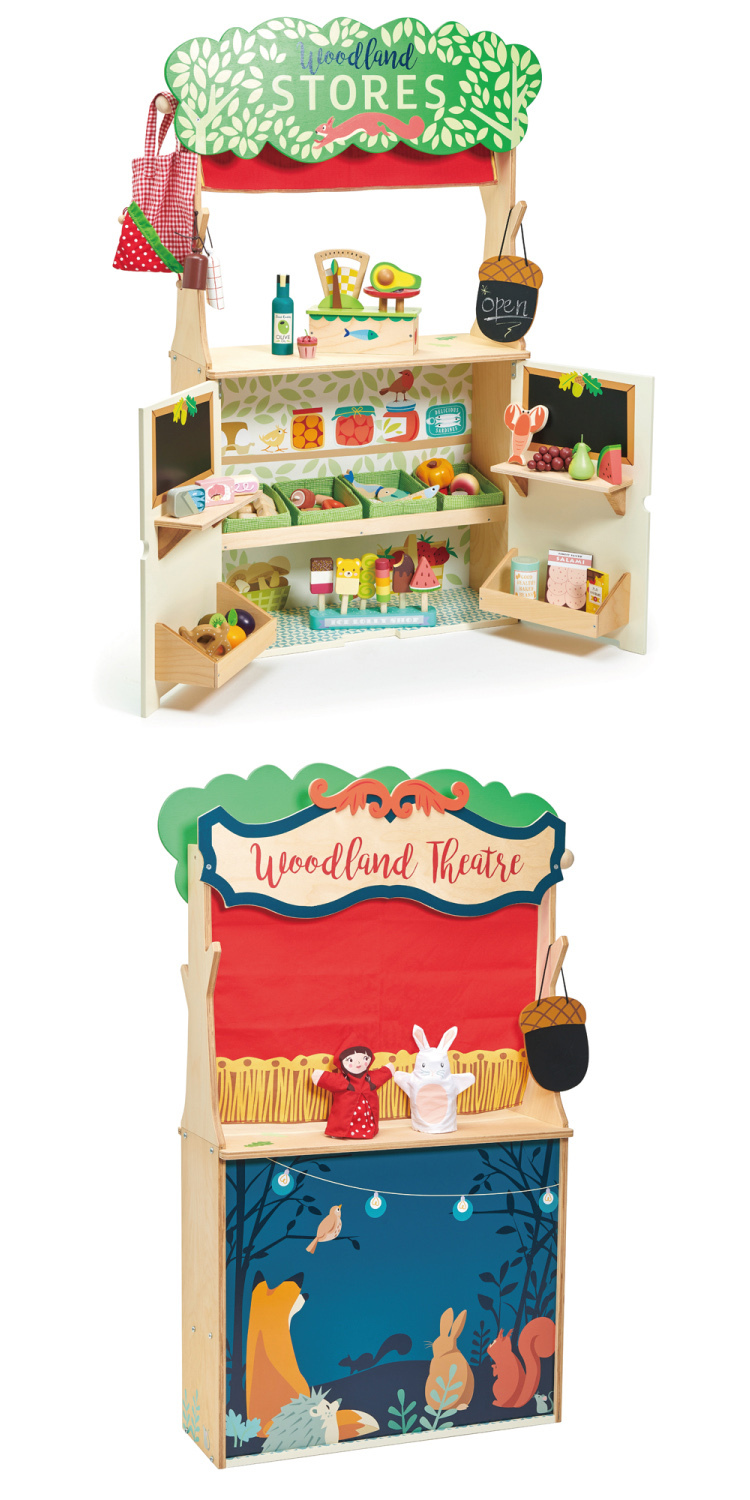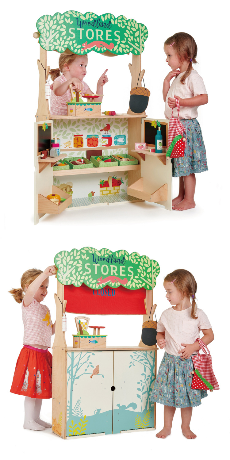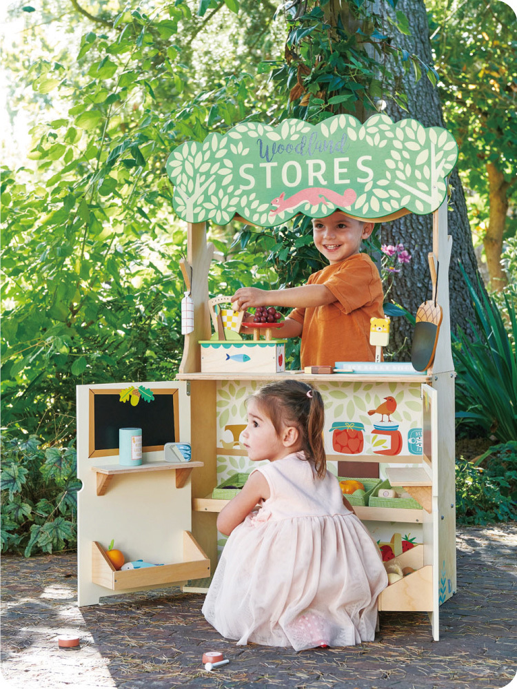 一款大型的遊戲商店,兩面都可以進行團體遊戲。一側是森林遊戲商店:它有2扇可打開的門,裡面是一家店舖,還有2個黑板區域可以塗鴉。有一個可拉下的窗簾,表示商店已打烊。在結構的另一面,商店變成森林戲院,我們還附上了2個可愛的布偶。一個橡實黑板,可以用粉筆寫上時間和日期,紅色的窗簾可以升起或放下,用於演出。